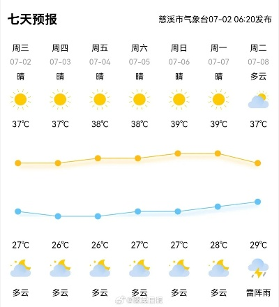 - 2025 - 07 - 06(后天):多云,气温在28℃至39℃徘徊,东南风微风,虽有一定云层遮挡,但气温仍较高,户外活动需注意适时休息,可携带一些清凉饮品,及时补充水分,防止中暑。